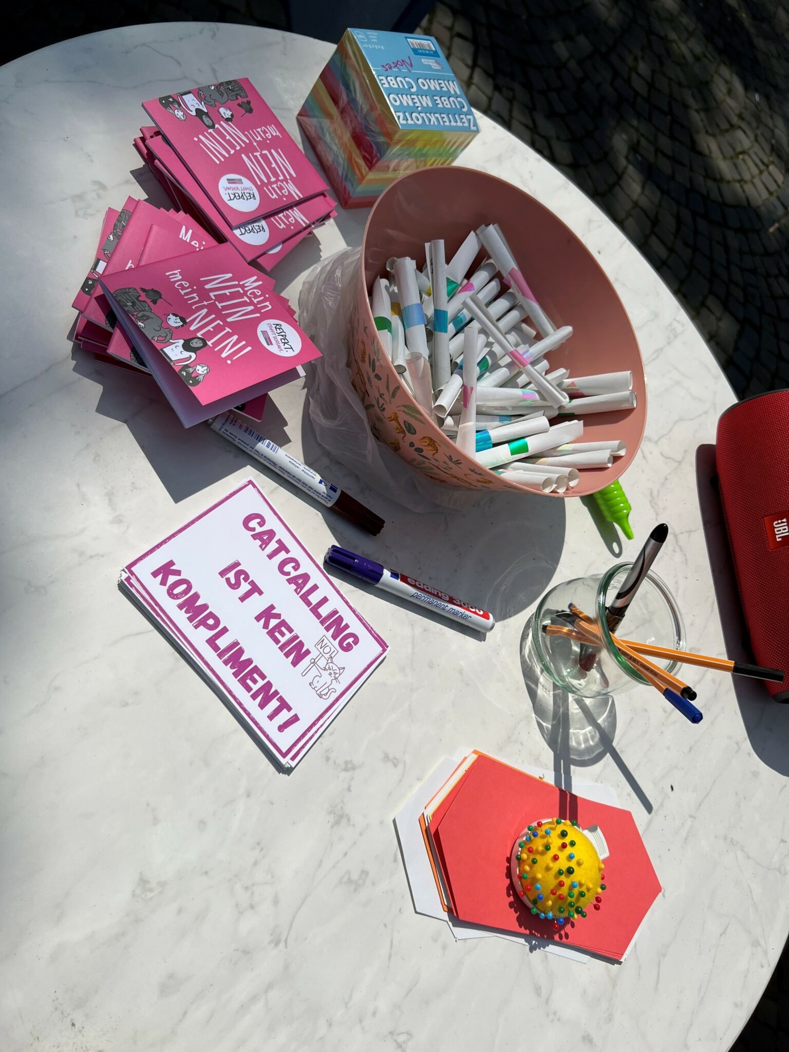Passant*innen sind mit uns ins Gespräch gekommen und konnten sich an Mitmachaktionen beteiligen. Frauen und Mädchen schrieben mit Kreide Aussagen auf den Gehwegen, die den betroffenen Personen gesagt worden sind. Des Weiteren konnten an Pinnwänden Gefühle und Gedanken der Betroffenen festgehalten werden, die durch das Catcalling ausgelöst worden sind. Oftmals wurden Gefühle wie Scham, Angst, Ekel und Wut genannt. Die Aktion hat verdeutlicht, wie alltäglich Catcalling für Mädchen und Frauen ist.